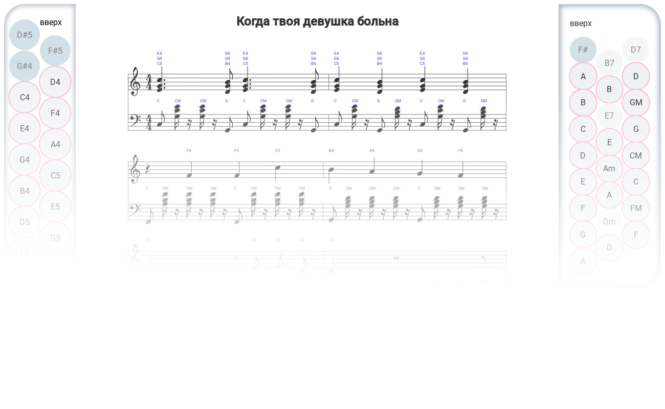 Урок - это ноты Когда твоя девушка больна (Кино ) для музыкального инструмента Гармонь, звук и виртуальные клавиатуры (аппликатуры). Уроки для музыкального инструмента Гармонь открываются в программe SMT Expert, которая наглядно покажет как сыграть Когда твоя девушка больна (Кино ) на музыкальном инструменте Гармонь.